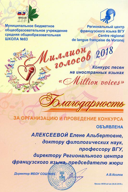 В рамках сотрудничества ВГУ со средними учебными заведениями города и области на базе партнера ВГУ МБОУ СОШ № 83 был организован 5-й областной конкурс песен на иностранных языках «Миллион голосов».