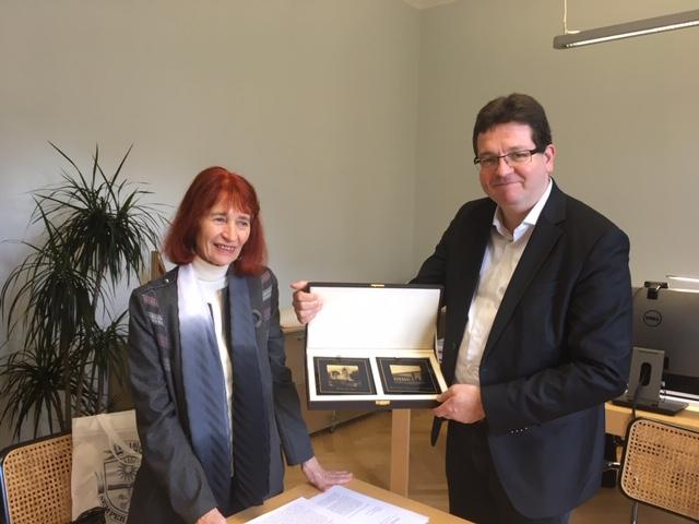 Вручение ректору университета им. Мартина Лютера проф. К. Титье письма от ректора ВГУ проф. Д.А. Ендовицкого и памятного подарка, посвященного 100-летию ВГУ.