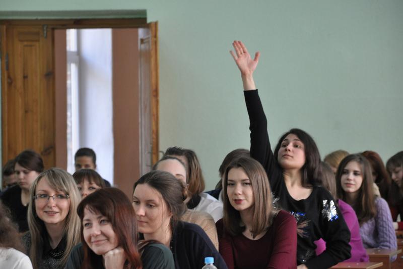 Elena Alexeyeva, Head of the Department of French Philology and Director of the Regional French Centre (VSU), Head of the Regional Division of the UTR (Voronezh), addressing the 1st year students to congratulate them on the International Translation Day