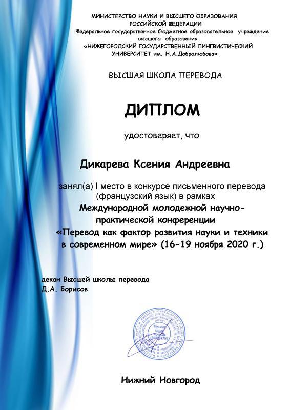 В конкурсе письменного (публицистического) перевода первое место заняла Дикарева Ксения, 4 к. (французский язык) и Попова Арина, 5 к. (немецкий язык), третье место у Прибытковой Алины, 3 к. (английский язык).