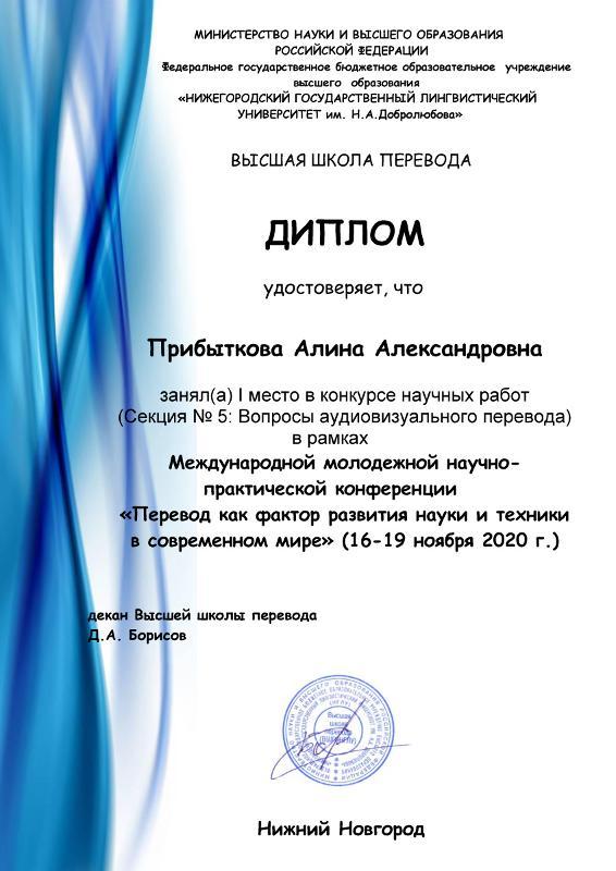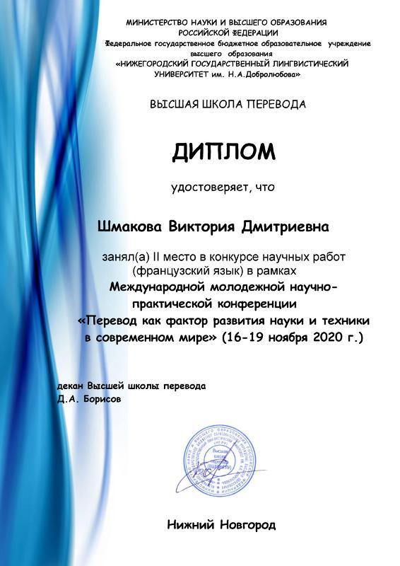 В конкурсе научных работ первое место заняла Прибыткова Алина с докладом на тему «Что в имени тебе моём: о конфликте рекламной и информативной функции при переводе названий фильмов (на материале м/ф "Храбрая сердцем")» (английский язык); второе место у Шмаковой Виктории, 4 к. «Трудности перевода франкоязычной подростковой литературы на примере романа Клода Роси «Кокомеро» (французский язык) и у Столяровой Елены, 4 к. «Европеизация высшего образования в аспекте перевода» (английский язык).