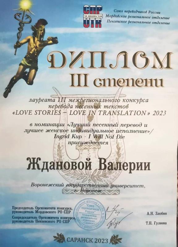 Валерия Жданова, студентка 5 курса направления «Перевод и переводоведение», вошла в число победителей III Межрегионального конкурса перевода песенных текстов «LOVE STORIES – LOVE IN TRANSLATION», который проводился Мордовским региональным отделением Союза переводчиков России c 14 по 28 февраля 2023 г. Подведение итогов состоялось в конце апреля и только сейчас пришёл долгожданный диплом победителя. Соорганизатором конкурса выступило Пензенское региональное отделение Союза переводчиков России. Среди приглашённых экспертов были члены Союза переводчиков России, а также переводчики, поэты, публицисты и прозаики.