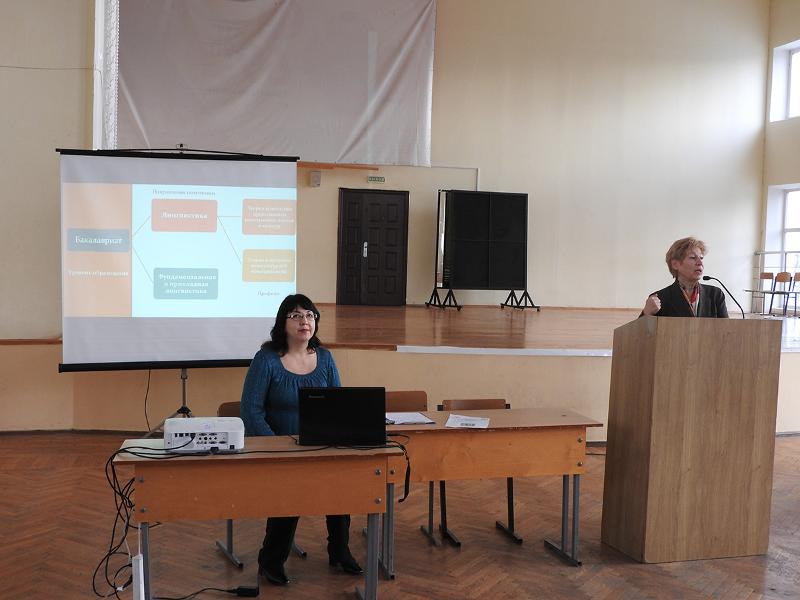 На общем собрании перед абитуриентами и их родителями с приветственным словом выступила декан факультета РГФ Ольга Борискина. Она рассказала школьникам и их родителям о направлениях и формах обучения на факультете романо-германской филологии, а также представила аудитории заведующих кафедрами факультета.