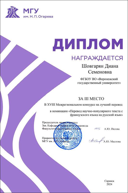 Шовгарян Диана, студентка 4 курса РГФ, (Перевод и переводоведение, французский язык) стала призером сразу в двух номинациях: с французским языком (3 место, номинация «Перевод научно-популярного текста с французского языка на русский язык») и с английским языком (3 место, номинация «Перевод научно-популярного текста с английского языка на русский язык»):