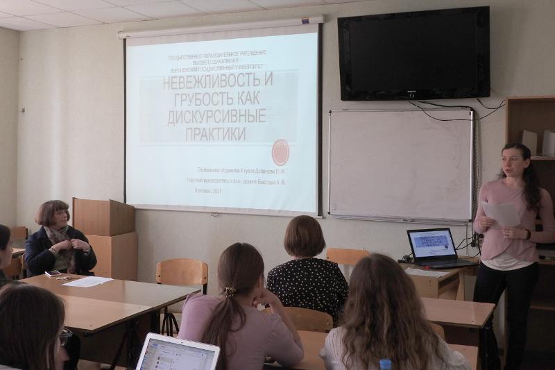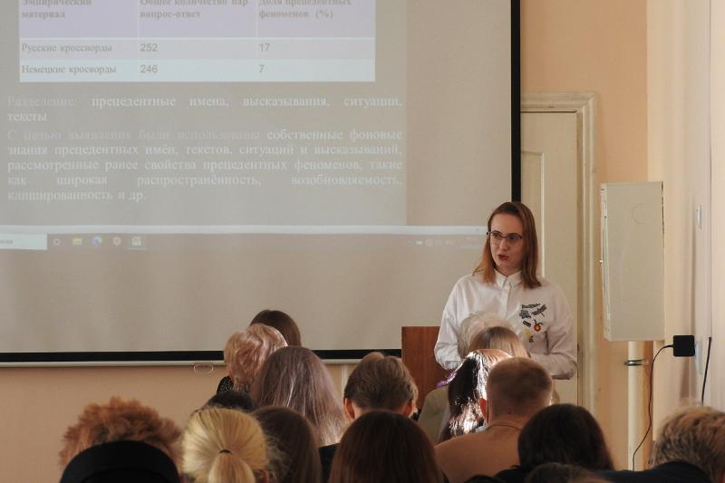 23 апреля на факультете романо-германской филологии прошла ежегодная студенческая научная сессия. Пленарным заседанием, на которое в качестве слушателей пришло большое количество студентов, по традиции руководили профессора Людмила Величкова и Алексей Кретов. Свои доклады представили студентки Ксения Дикарева (научный руководитель – доктор филологических наук Наталья Фененко), Анастасия Шудрикова (научный руководитель – профессор Алексей Кретов) и Олеся Макаренко (научный руководитель – профессор Людмила Гришаева).
