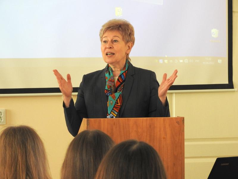 В 13:30 в аудитории 40 открылось пленарное заседание. Большая аудитория была наполнена на 100%. С приветственным словом к собравшимся обратилась декан факультета, доктор филологических наук, заведующая кафедрой английского языка гуманитарных факультетов Ольга Олеговна Борискина.