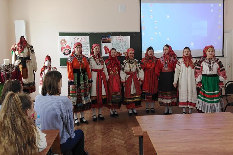 В рамках «Года Народного искусства и нематериального культурного наследия народов России», объявленного Указом № 745 от 30 декабря 2021 года Президентом РФ В.В. Путиным, студенты и магистранты кафедры французской филологии провели культурно-просветительскую конференцию «Путешествие по Воронежскому краю», посвященную культурному и историческому наследию Воронежской области. Целью мероприятия является популяризация народного искусства, сохранение культурных традиций, памятников истории и культуры Воронежской области; воспитание у студентов уважительного отношения к культурным достопримечательностям родного края, чувство гордости за свою Родину; умение продвигать культуру Воронежской области за рубежом на французском языке. Студенты и магистранты кафедры французской филологии представили свои проекты о Воронежской области на французском языке, а студенты переводческого отделения осуществляли перевод презентаций на русский язык. Участие в конференции позволило студентам ознакомиться с такими аспектами Воронежской области как история, православные монастыри, основные географические объекты (реки, меловые горы, лесные массивы), кухня, народные костюмы, музыка и стихи, диалекты. В мероприятии участвовали также представители музея этнографии филологического факультета, представившие аутентичные костюмы Воронежской области, и народный ансамбль фольклорной песни «Терем», исполнивший старинные воронежские песни.
