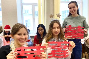 Студенты-переводчики, в свою очередь, погрузили наших китайских друзей в атмосферу русских традиций, рассказав о том, как отмечают Новый год в России: что принято дарить, желать и чем угощать за праздничным столом. Арина Лынова и Вероника Козко исполнили веселые колядки, а София Семененко рассказала о русской традиции вырезания снежинок из бумаги и провела мастер-класс по созданию (именно так!) сложной снежинки. В завершение дружеской встречи и по правилам гостеприимства переводчики РГФ подарили китайским друзьям печенье с пожеланиями, маленькие поздравительные открытки и декоративные украшения для их комнат в студенческом общежитии. Финальным аккордом стала совместная песня на английском языке «Twelve days of Christmas» и общая фотография у факультетской праздничной елки! Как отметила Лариса Григорьевна Кузьмина, заведующая кафедрой перевода и профессиональной коммуникации, «уроки друг другу» – реальная практика межкультурного общения!»