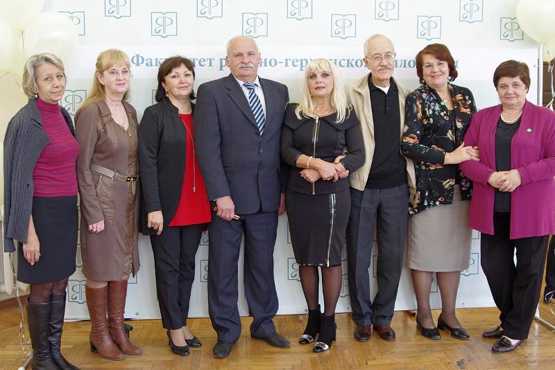 И все радостно, хотя иногда со слезами на глазах, вспоминали студенческие годы. Вместе с нынешним студсоветом выпускники спели Гимн РГФ. Затем на экране появились кадры кинохроники о раннем периоде РГФ: кафедра английской филологии под руководством Е.И. Волковой; кафедра немецкой филологии под руководством Г.Е. Веделя; французская кафедра под руководством А.С. Шкляевой и испанская кафедра под руководством Хосе Морено Пальи.