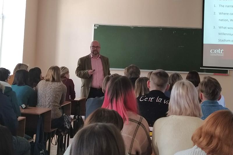 22 ноября Нил Харрис, представитель центра изучения английского языка из г. Кардифф, Уэльс (Великобритания) провёл семинар для студентов факультета романо-германской филологии. Нил рассказал студентам о природе, достопримечательностях и культуре Уэльса, а также о преимуществах изучения английского языка в г. Кардифф.