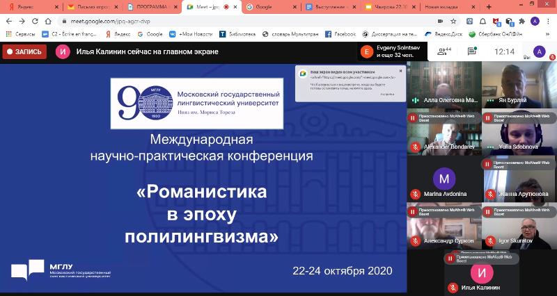 Преподаватели факультета РГФ приняли участие в международной научно-практической конференции «Романистика в эпоху полилингвизма», которая проводится в рамках празднования 90-летия Московского государственного лингвистического университета. В рамках конференции был рассмотрен широкий спектр вопросов, направленных на изучение проблем современной романистики, на популяризацию научных исследований в области романской лингвистики, переводоведения, на укрепление партнерских отношений с российскими и французскими университетами, на изучение лингвокультурологического наследия франкофонного мира. Актуальность изучения диалога культур в полилингвальном романском пространстве было отмечено в приветственных выступлениях послов Франции, Колумбии, Мексики, Швейцарии, Португалии. Зав. кафедрой французской филологии профессор Е.А. Алексеева приняла участие в конференции в качестве модератора; представила результаты исследования в области французского синтаксиса, которые реализуются на кафедре французской филологии. С докладом на конференции выступила преподаватель кафедры французской филологии А.А. Чвирова.