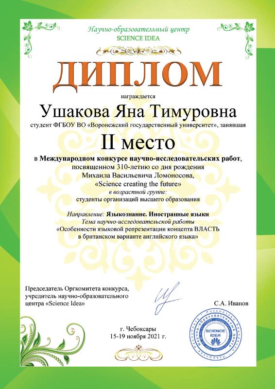 Студентка 4 курса бакалавриата, обучающаяся по направлению «Лингвистика» (профиль «Теория и практика межкультурной коммуникации») факультета романо-германской филологии Яна Ушакова заняла второе место в Международном конкурсе научно-исследовательских работ студентов организаций высшего образования Science for creating the future, посвященном 310-летию со дня рождения Михаила Васильевича Ломоносова.