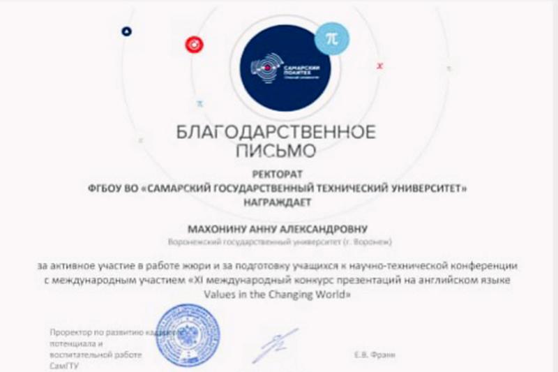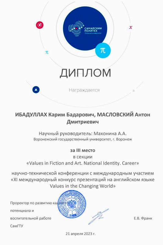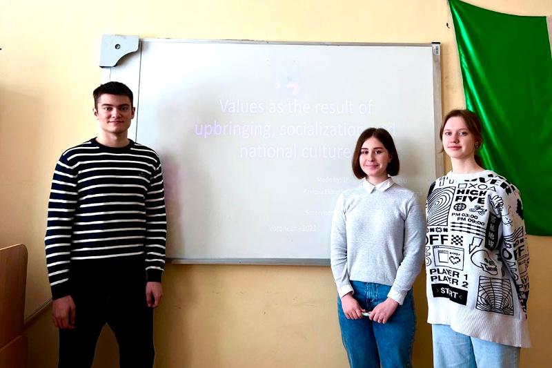 Диплом за 1 место в секции «Family and Education» получили студенты 2 курса София Сучкова, Егор Вендеревских и Алина Душкина. Диплом за 2 место – студенты 1 курса Сергей Черенков, Екатерина Павлова, Анастасия Лисицына. Диплом за 3 место в секции «Values in Fiction and art.National identity. Career» получили студенты 1 курса Карим Ибадуллах и Антон Масловский.
