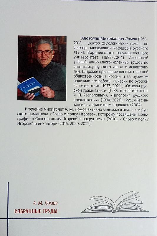Издательский дом ВГУ выпустил сборник избранных работ известного отечественного учёного, доктора филологических наук, профессора ВГУ Анатолия Михайловича Ломова (1935–2018). Анатолий Михайлович более полувека отдал университету, работая сначала на кафедрах русского языка как иностранного, а затем на кафедре русского языка филологического факультета. В круг научных интересов ученого входили морфология, синтаксис, история русского языка, которым были посвящены его фундаментальные монографии, ставшие классическими работами. Кроме того, А.М. Ломов являлся известным слововедом: им была предложена интересная гипотеза об авторе «Слова о полку Игореве».