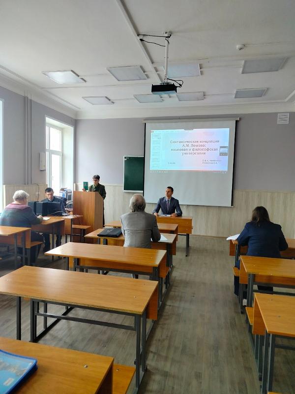 На заседании был представлен доклад ученицы Анатолия Михайловича Ломова, заведующей кафедрой французской филологии факультета РГФ ВГУ Елены Альбертовны Алексеевой. Темой ее выступления стала «Синтаксическая концепция А.М. Ломова как языковая и философская универсалия».