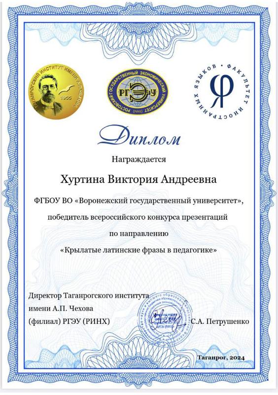 С 15 октября по 15 декабря Таганрогским институтом имени А.П. Чехова (филиалом) ФГБОУ ВО «РГЭУ (РИНХ)» проводился Всероссийский конкурс презентаций «Крылатые латинские фразы через призму эпохи». Участниками Конкурса стали обучающиеся школ и студенты средних и высших профессиональных учреждений России (Таганрога, Ейска, Ростова-на-Дону, Геленджика, Воронежа). Всего на конкурс поступило 104 работы.