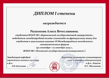 Студентка 5 курса отделения «Перевод и переводоведение» (французский и английский языки) Алиса Разинкова получила диплом первой степени в Международной онлайн-олимпиаде по французскому языку, проводившейся в рамках III Международного молодежного лингвистического форума ПсковГУ.