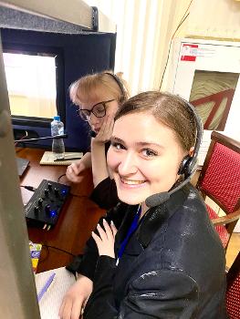 Параллельно с осуществлением устного последовательного перевода студенты имели возможность попробовать свои силы в синхронном переводе, работая в специальной кабине для синхронного перевода. Присутствующие в зале могли послушать «синхронистов», большинство которых успешно справились со своей задачей.