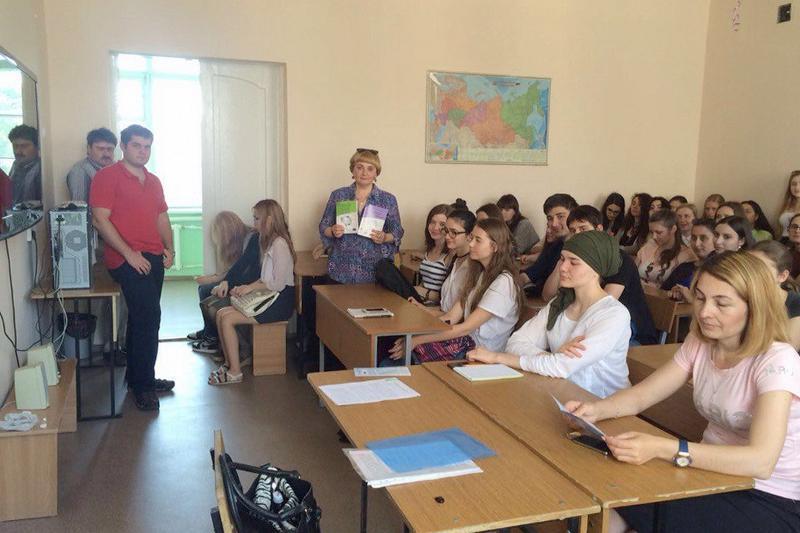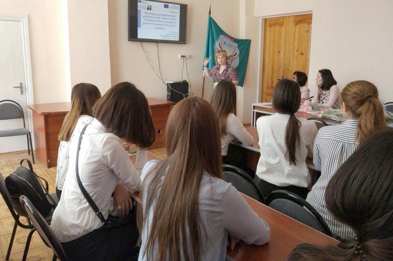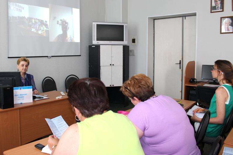 Первое прошло в Пятигорском государственном университете и было связано с распространением опыта работы проекта. Руководитель проекта, заведующий кафедрой французской филологии, профессор Елена Алексеева провела презентацию проекта и мастер-класс для преподавателей и студентов ПГУ французского, немецкого и испанского отделений. В рамках презентации Елена Альбертовна рассказала о цели проекта – совершенствовании профессиональных компетенций студентов-лингвистов, специальность которых напрямую не связана с изучением Европейского Союза. Они улучшаются за счет внедрения в программу подготовки углубленного изучения аспектов функционирования ЕС и вопросов европейской идентичности.