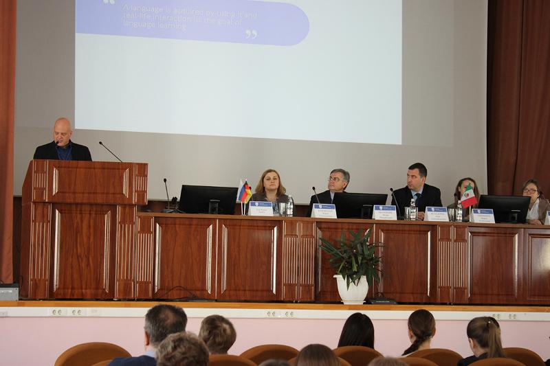 Первым на пленарном заседании выступил профессор д-р Томас Райт (Prof. Dr. Thomas Raith), директор Института англистики факультета культуры и социальных наук, начальник управления информационных технологий Педагогического университета г. Фрайбург (Германия) с докладом "Research-based principles and methods in foreign language teaching – focus on learners, content and tasks". Доктор Томас Райт осветил историю методологии обучения иностранным языкам и поделился европейским видением организации процесса обучения иностранным языкам.