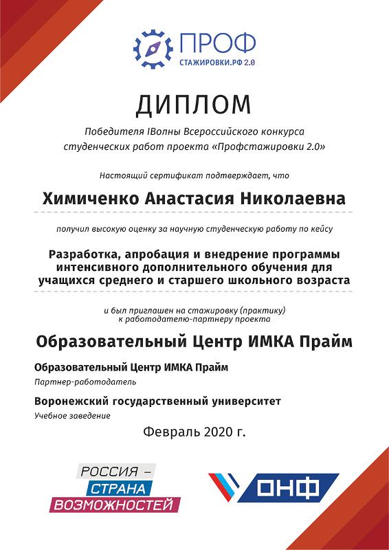 Так, А.Н. Химиченко выполнила кейс «Разработка, апробация и внедрение программы интенсивного дополнительного обучения для учащихся среднего и старшего школьного возраста», который был предложен Образовательным Центром ИМКА Прайм (Алтайский край, г. Барнаул). Анастасия Николаевна представила на конкурс курсовую работу на тему «Использование smart-приложений в организации самостоятельной работы по иностранному языку на средней ступени общеобразовательной школы и в учреждениях дополнительного образования». Работодатель высоко оценил представленную на конкурс курсовую работу и пригласил студентку на стажировку, которая состоялась 25.02.2020 в виде вебинара с сотрудниками Центра.