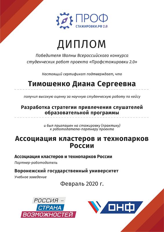 Д.С. Тимошенко разрабатывала кейс на тему «Разработка стратегии привлечения слушателей образовательной программы» по заказу работодателя «Ассоциация кластеров и технопарков России» (г. Москва). Диана Сергеевна в результате конкурсного отбора представленных студенческих работ приглашена на 10-дневную стажировку для участия в проекте, которая состоится в марте 2020 г.