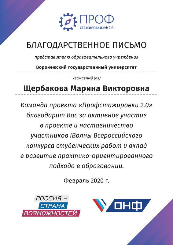 Магистрантки факультета РГФ награждены дипломами победителей Первой волны Конкурса, а их научный руководитель, доцент М.В. Щербакова, получила от команды проекта «Профстажировки 2.0» Благодарственное письмо за активное участие в проекте, наставничество участников Всероссийского конкурса студенческих работ и вклад в развитие практико-ориентированного подхода в образовании.