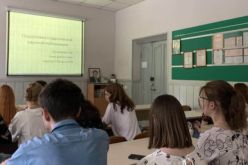8 июня 2022 г. состоялось открытое заседание студенческого научного объединения факультета РГФ. С докладом «Подготовка студенческой научной публикации» выступил куратор СНО ф-та РГФ, кандидат филологических наук, преподаватель кафедры английской филологии Павел Борисович Кузьменко.