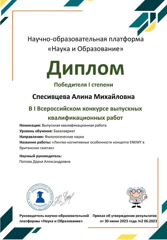 Студентка выпускного курса бакалавриата по специальности «Теория и практика межкультурной коммуникации» (кафедра английской филологии) Алина Спесивцева заняла 1 место в I Всероссийском конкурсе выпускных квалификационных работ на научно-образовательной платформе «Наука и образование» со своей ВКР на тему «Лингво-когнитивные особенности концепта ENEMY в британских газетах» (научный руководитель – Попова Д.А.)