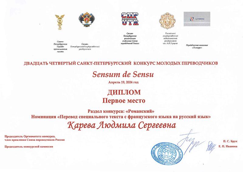 Студентка 2 курса факультета романо-германской филологии Карева Людмила заняла 1 место в общероссийском Санкт-Петербургском конкурсе молодых переводчиков «Sensum de Sensu» в номинации «Перевод специального текста с французского языка на русский язык».