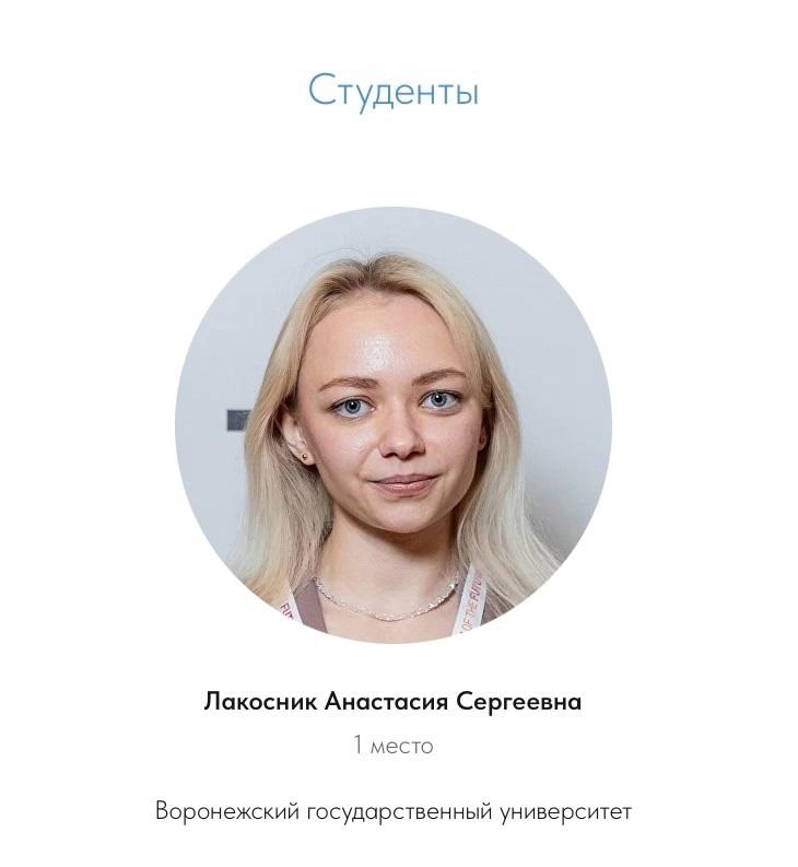 30 октября Лакосник Анастасия выступила с научно-исследовательской работой на тему: «Средства выражения эмоциональности в звучащей русской и испанской речи (на материале телевизионных дебатов по проблемам окружающей среды)», написанной под руководством кандидата филологических наук, доцента кафедры романской филологии факультета РГФ ВГУ Ольги Васильевны Абакумовой, за которую её объявили победителем секции «Гуманитарные науки».