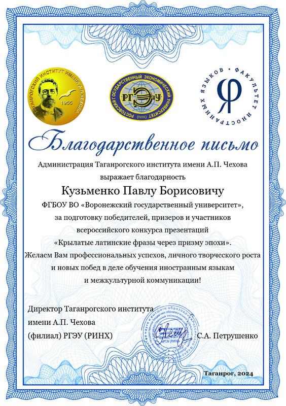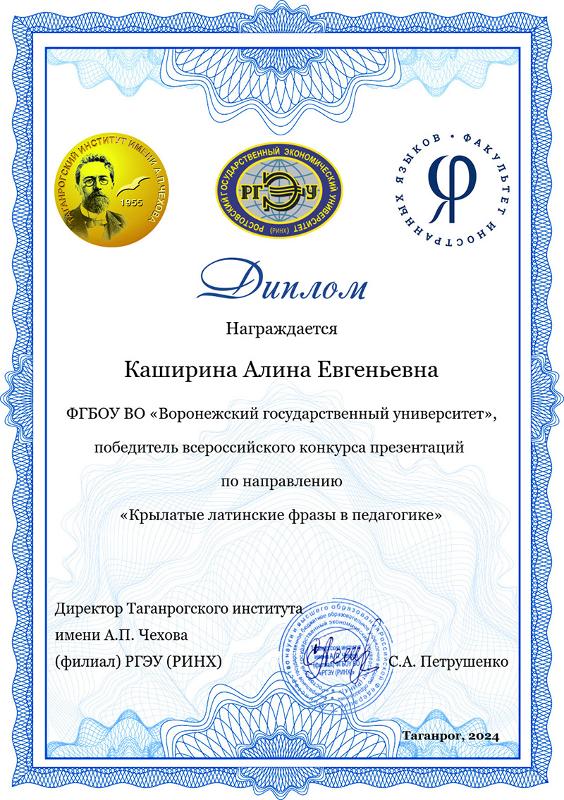 С 15 октября по 15 декабря Таганрогским институтом имени А.П. Чехова (филиалом) ФГБОУ ВО «РГЭУ (РИНХ)» проводился Всероссийский конкурс презентаций «Крылатые латинские фразы через призму эпохи». Участниками Конкурса стали обучающиеся школ и студенты средних и высших профессиональных учреждений России (Таганрога, Ейска, Ростова-на-Дону, Геленджика, Воронежа). Всего на конкурс поступило 104 работы.