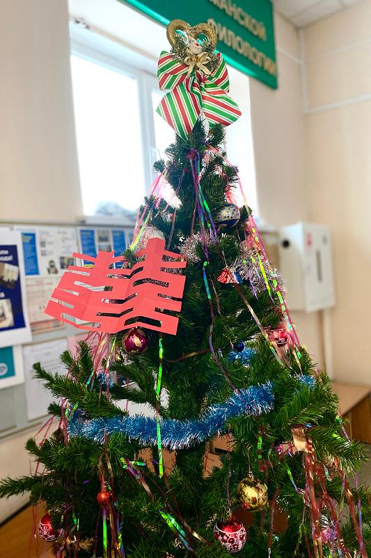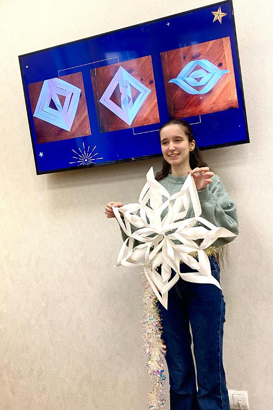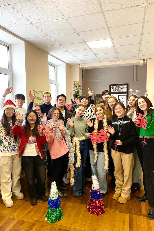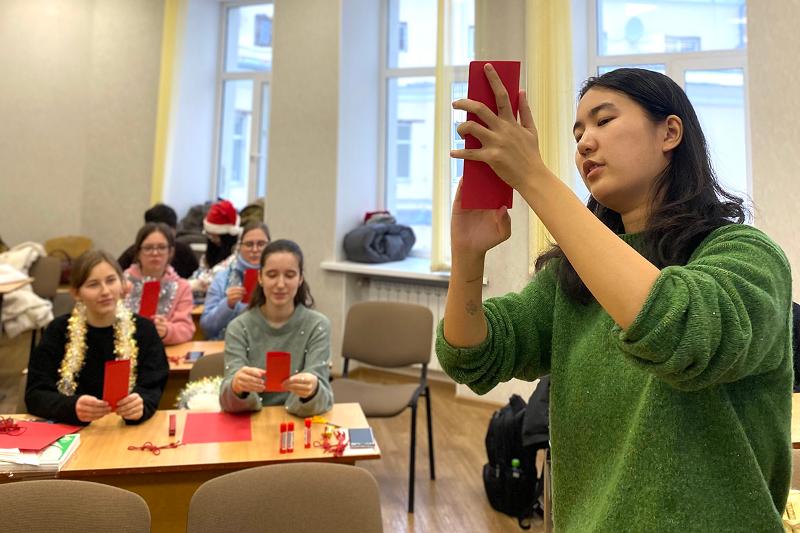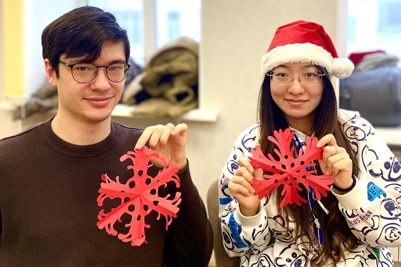 Студенты-переводчики, в свою очередь, погрузили наших китайских друзей в атмосферу русских традиций, рассказав о том, как отмечают Новый год в России: что принято дарить, желать и чем угощать за праздничным столом. Арина Лынова и Вероника Козко исполнили веселые колядки, а София Семененко рассказала о русской традиции вырезания снежинок из бумаги и провела мастер-класс по созданию (именно так!) сложной снежинки. В завершение дружеской встречи и по правилам гостеприимства переводчики РГФ подарили китайским друзьям печенье с пожеланиями, маленькие поздравительные открытки и декоративные украшения для их комнат в студенческом общежитии. Финальным аккордом стала совместная песня на английском языке «Twelve days of Christmas» и общая фотография у факультетской праздничной елки! Как отметила Лариса Григорьевна Кузьмина, заведующая кафедрой перевода и профессиональной коммуникации, «уроки друг другу» – реальная практика межкультурного общения!»